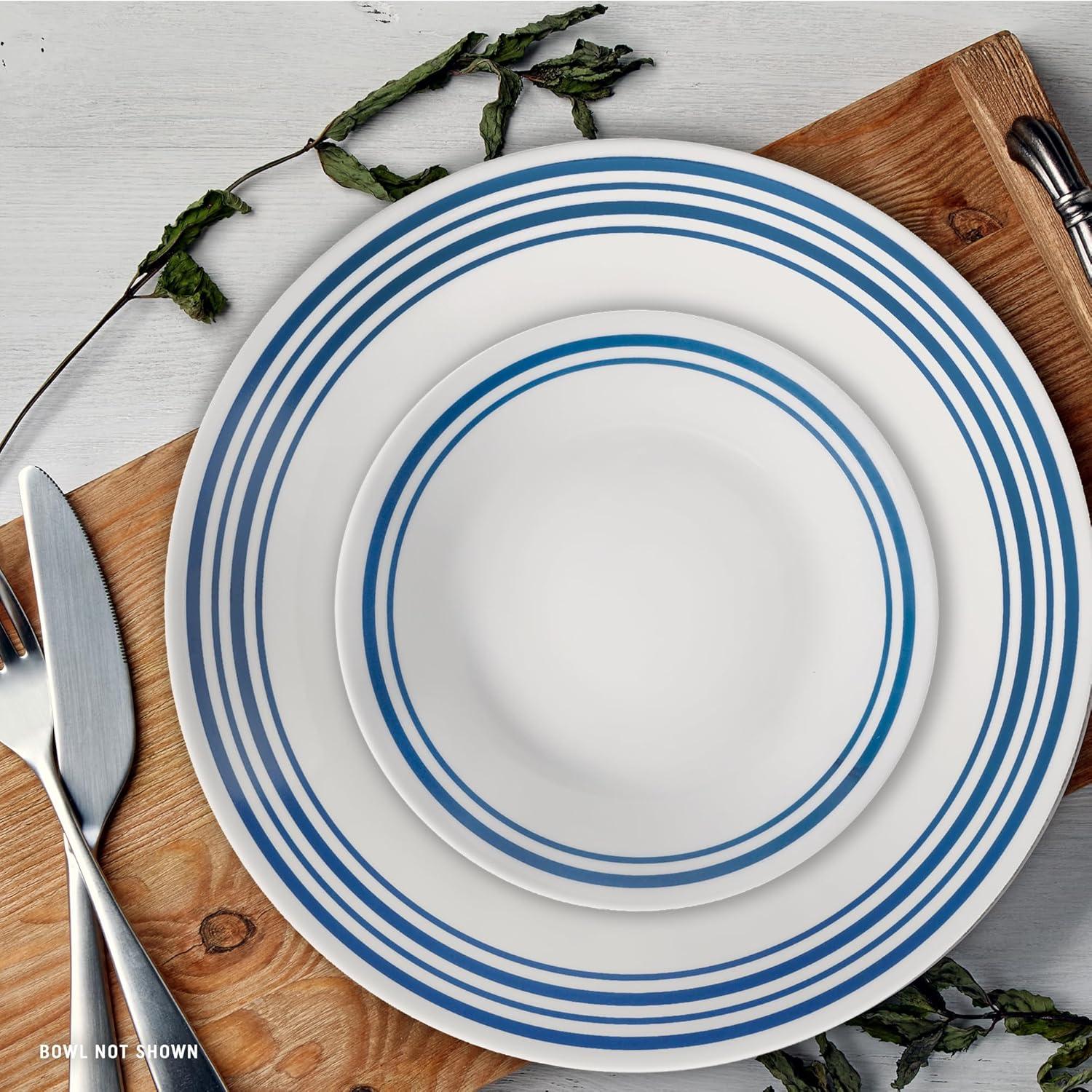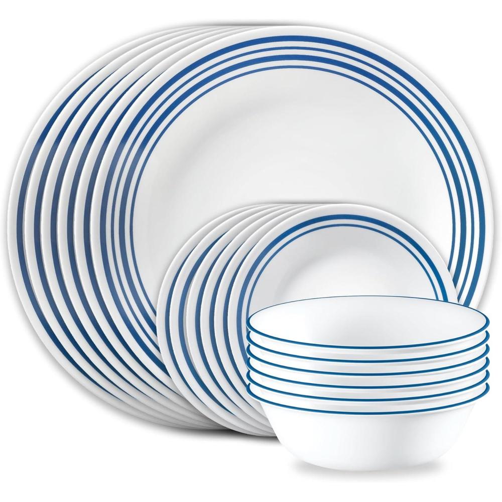 Functional and versatile, this Corelle living ware dinnerware set brings timeless and classic styling to your dining experience. This set includes 18 pieces total, including six (6) sets of each: 10-1/4-inch dinner plates, 6-3/4-inch bread and butter plates, and 18-ounce soup/cereal bowls. Measured bands in classic blue encircle plates in this coordinated coupe collection. Uplifting and sleek, this versatile, contemporary pattern offers just the right touch of timeless simplicity to any modern table setting. All pieces are made of Corelle triple-layer strong Glass, which is break and Chip Resistant, lightweight, and easily stackable for space saving. Dishwasher safe, this non-porous and versatile dinnerware can be used in the microwave and oven.